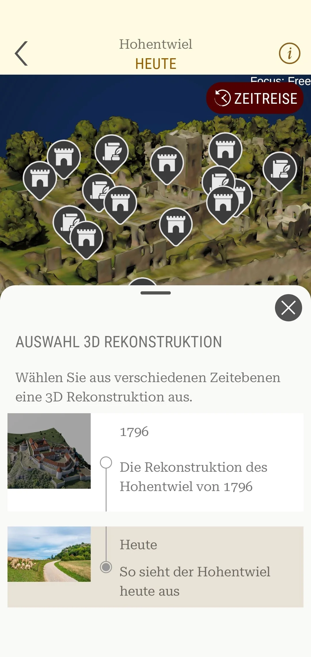 Die App Monumente 3D ist ein Multimediaguide für die Staatlichen Schlösser und Gärten Baden-Württemberg. Für diese haben wir eine GuidePilot-App entwickelt, die Besuchern eine virtuelle Reise ins Jahr 1620 zur Festung Hohentwiel ermöglicht. Mithilfe von Mixed Reality können aufwendige 3D-Modelle beim Spaziergang durch die Festungsruine aus der Fußgängerperspektive erkundet werden. Auf diese Weise werden die Gäste dazu eingeladen, die Geschichte und Besonderheiten des Berges zu entdecken. Darüber hinaus bietet die App weiteren Zugang zu Informationen rund um die Ortschaft, von Gebäuden und ihren Geschichten bis hin zur Flora und Fauna. Weitere Liegenschaften der SSG werden schrittweise hinzugefügt.
